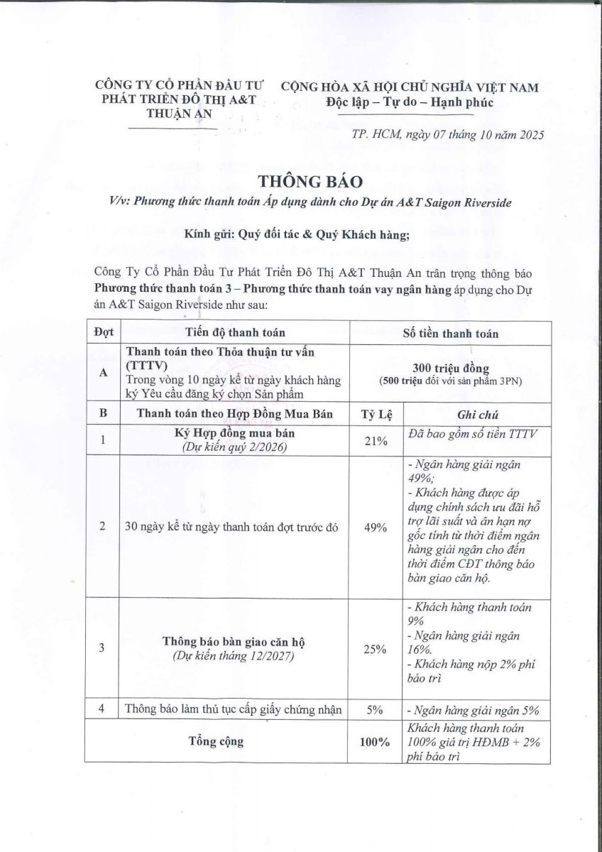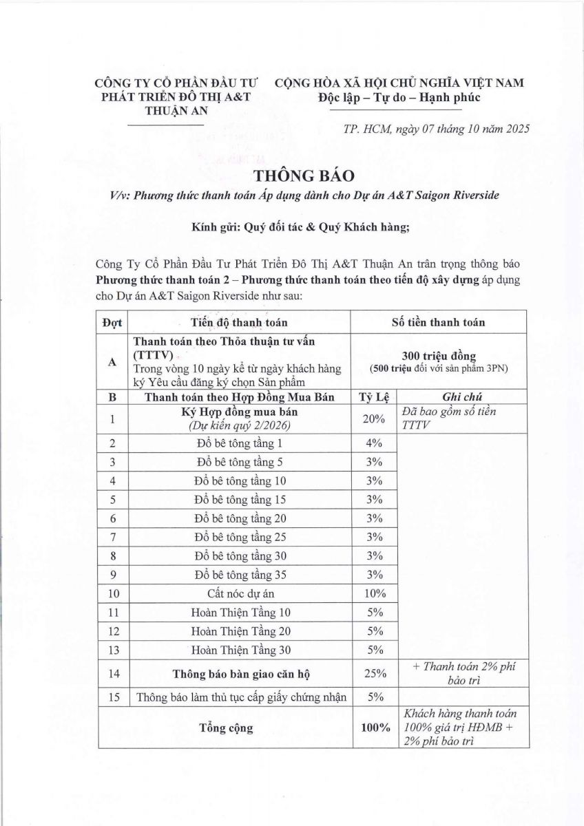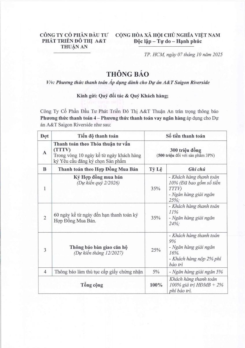 PHƯƠNG THỨC THANH TOÁN DỰ ÁN A&T SAIGON RIVERSIDE