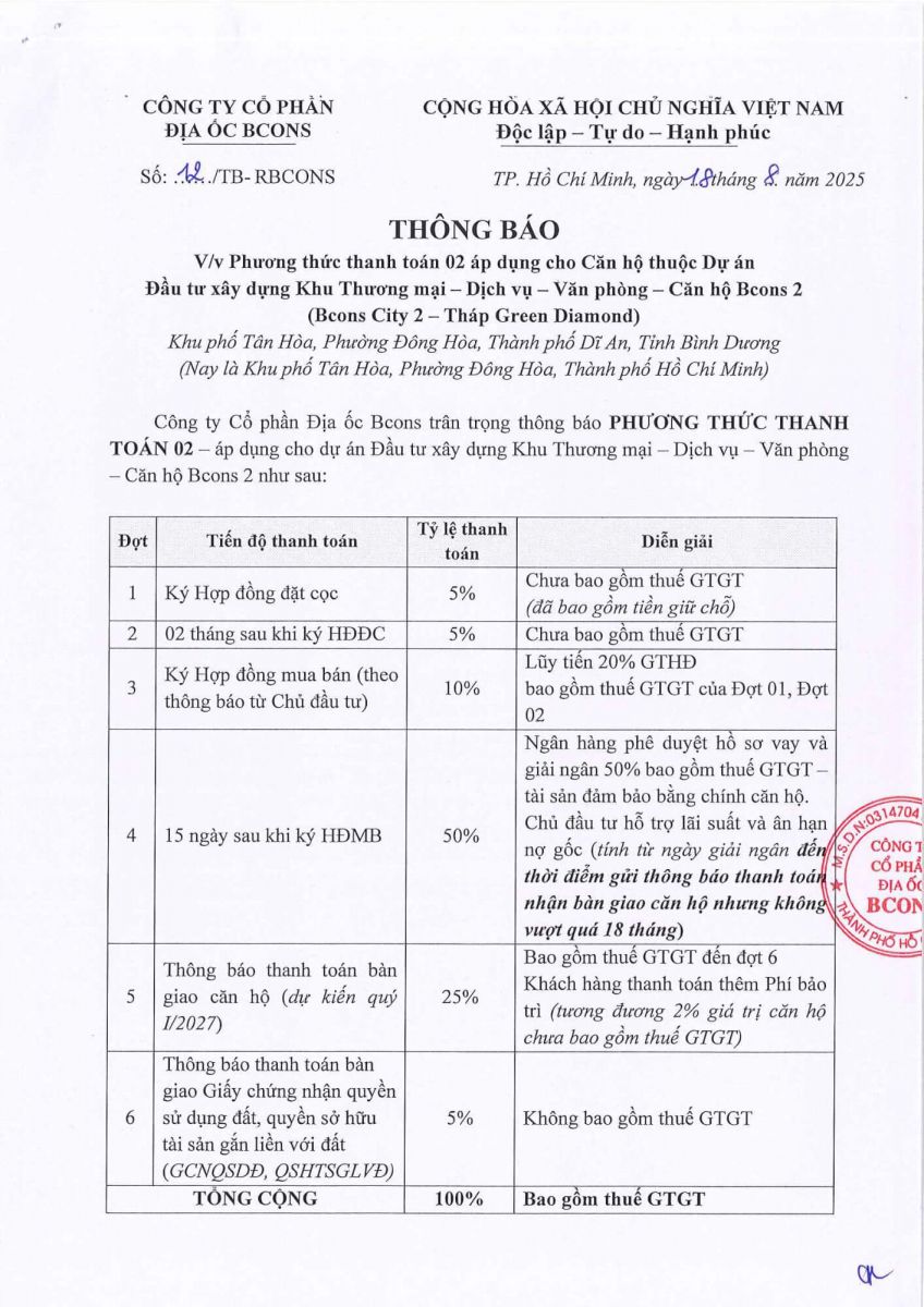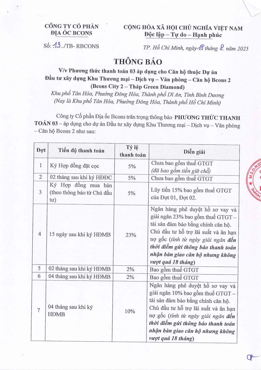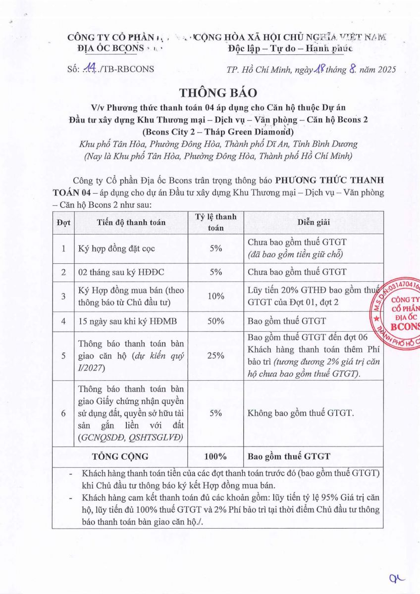 PHƯƠNG THỨC THANH TOÁN THÁP GREEN DIAMOND - BCONS CITY
