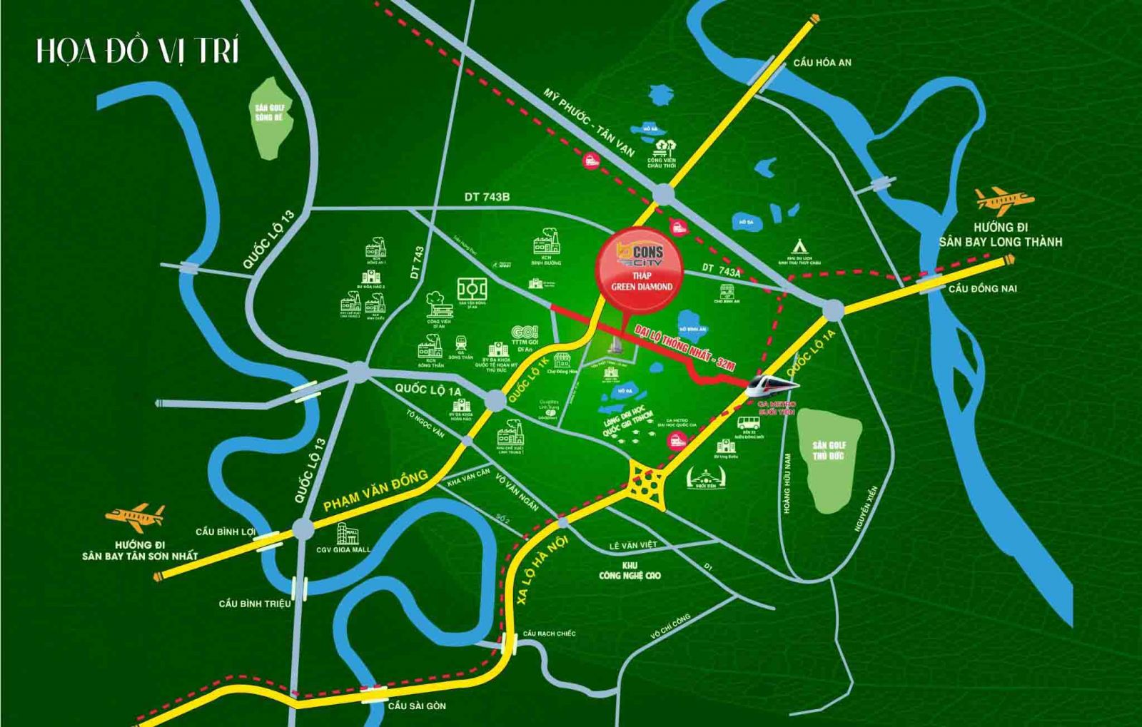 Căn hộ Green Diamond tọa lạc ngay mặt tiền đại lộ Thống Nhất rộng 32m, tuyến đường huyết mạch kết nối trực tiếp với Metro. Từ dự án Bcons City, cư dân chỉ mất chưa đến 25 phút để di chuyển vào trung tâm hành chính TP.HCM cũng như các khu vực kinh tế lân cận.