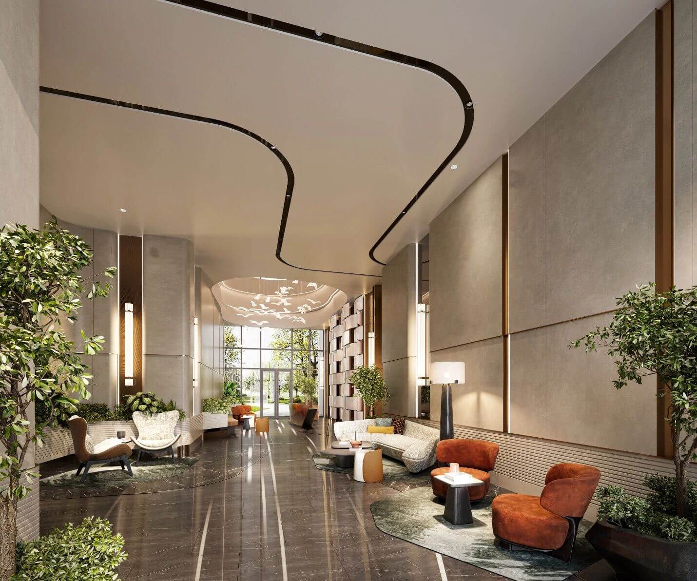 Không gian sảnh đón Royal Lobby mang phong cách thiết kế đậm chất quiet luxury của tháp Orion dự án TT AVIO