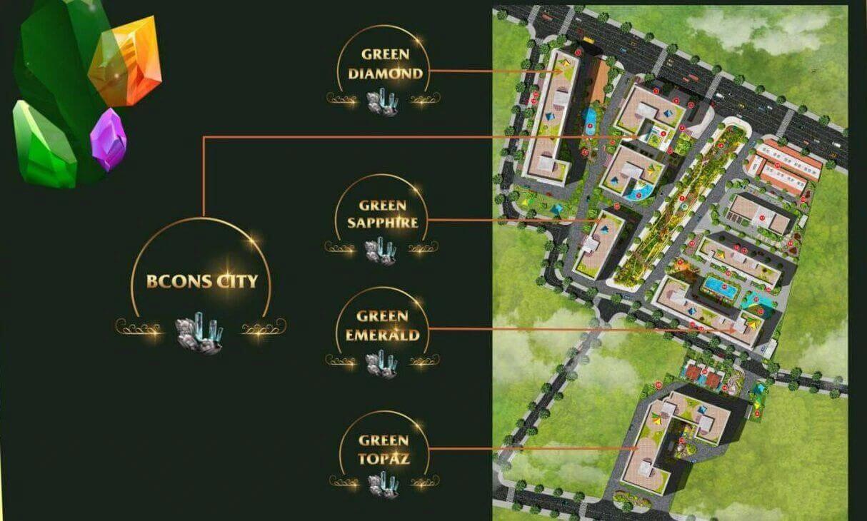 Bcons City có quy mô gần 5ha với 5 tòa tháp cao từ 27 – 29 tầng: Green Topaz, Bcons City, Green Emerald, Green Sapphire và cuối cùng là Green Diamond. Tổng cộng dự án cung cấp ra thị trường khoảng 3.900 căn hộ ở và căn hộ dịch vụ.