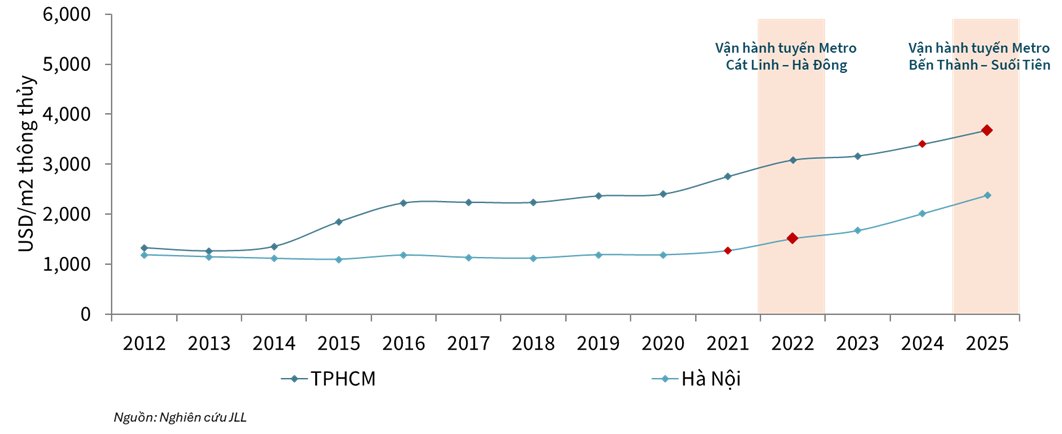 Đáng chú ý, giá bán các dự án liền kề metro tăng trung bình từ 200–250 USD/m² chỉ trong một năm sau khi tuyến metro đi vào hoạt động. Mức tăng này tương đương tốc độ tăng trưởng khoảng 8% mỗi năm, cao gấp đôi so với mặt bằng chung của thị trường TP.HCM.
