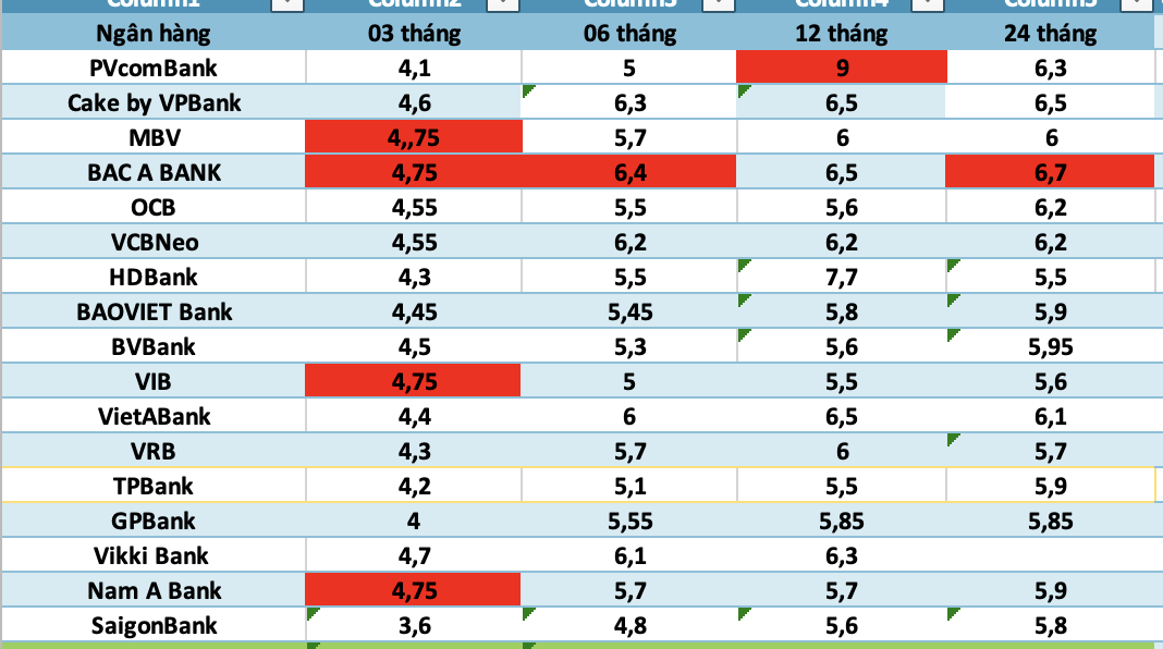 Vikki Bank áp dụng lãi suất 7,5%/năm cho tiền gửi kỳ hạn từ 13 tháng trở lên, với số tiền tối thiểu 999 tỉ đồng; Bac A Bank đang áp dụng mức lãi suất cao nhất 6,5%/năm cho các kỳ hạn từ 18 đến 36 tháng, 6,3%/năm với kỳ hạn 13–15 tháng và 6,1%/năm, kỳ hạn 6-8 tháng ở mức 6%/năm, kỳ hạn 9-11 tháng là 6,05%/năm, kỳ hạn 12 tháng là 6,2%/năm.