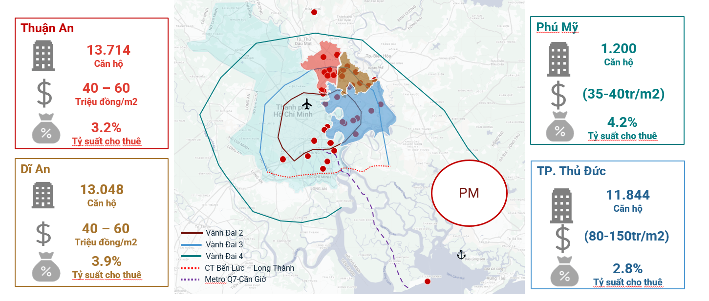 So sánh mặt bằng giá cho thấy, căn hộ tại Phú Mỹ hiện chỉ dao động 35–40 triệu đồng/m², thấp hơn 40–100% so với Thuận An, Dĩ An (40–60 triệu đồng/m²) và TP. Thủ Đức (80–150 triệu đồng/m²).