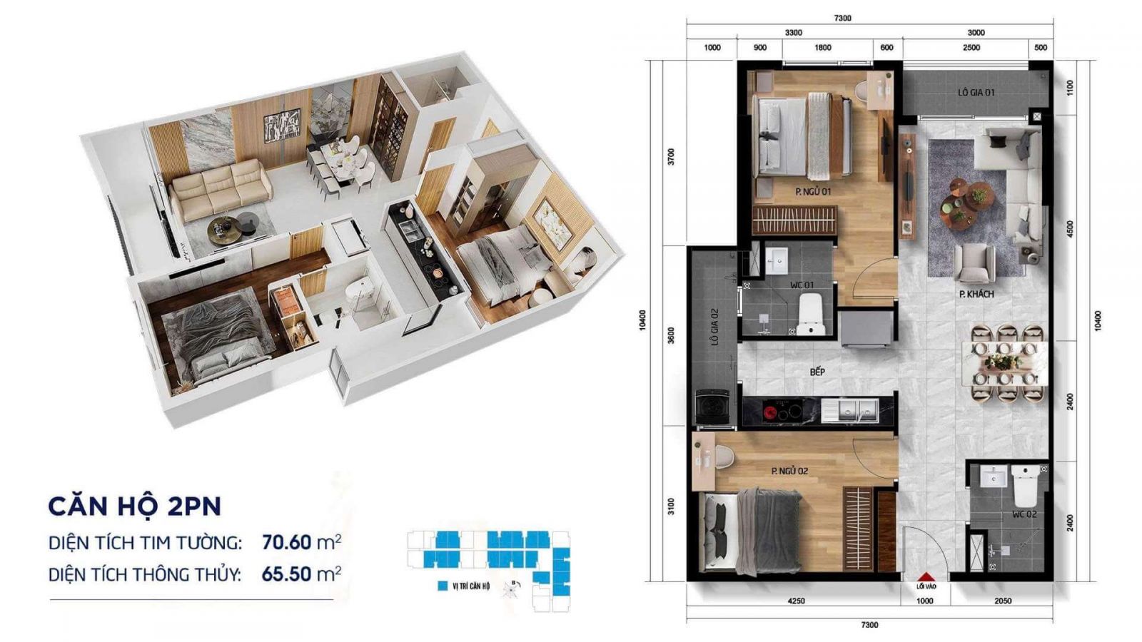 Căn hộ 2 phòng ngủ – 2 phòng vệ sinh (70–80m²): Lựa chọn phổ biến cho các gia đình nhỏ