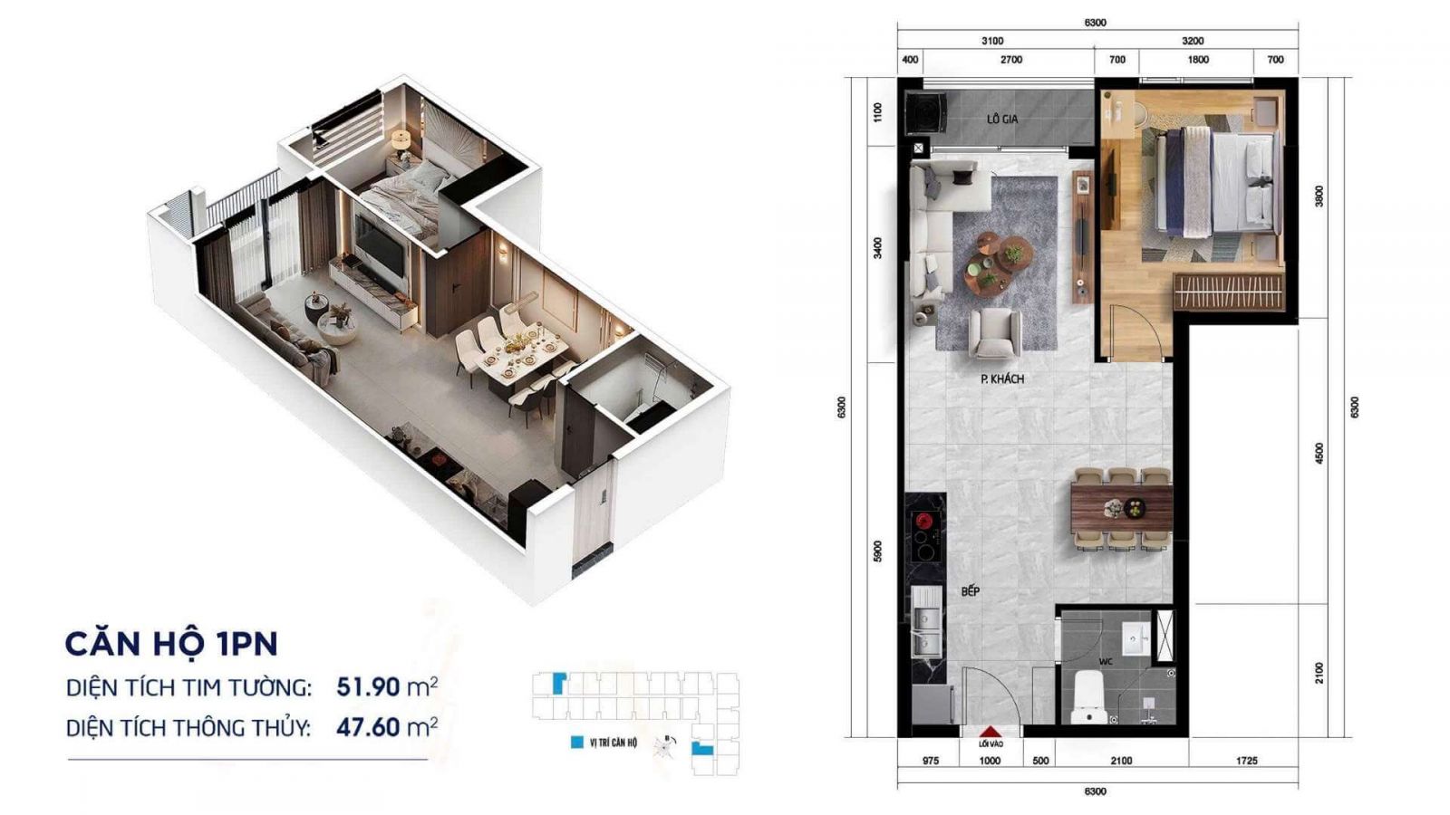 Căn hộ 1 phòng ngủ – 1 phòng vệ sinh (52m²): Phù hợp với người độc thân hoặc cặp đôi mới cưới