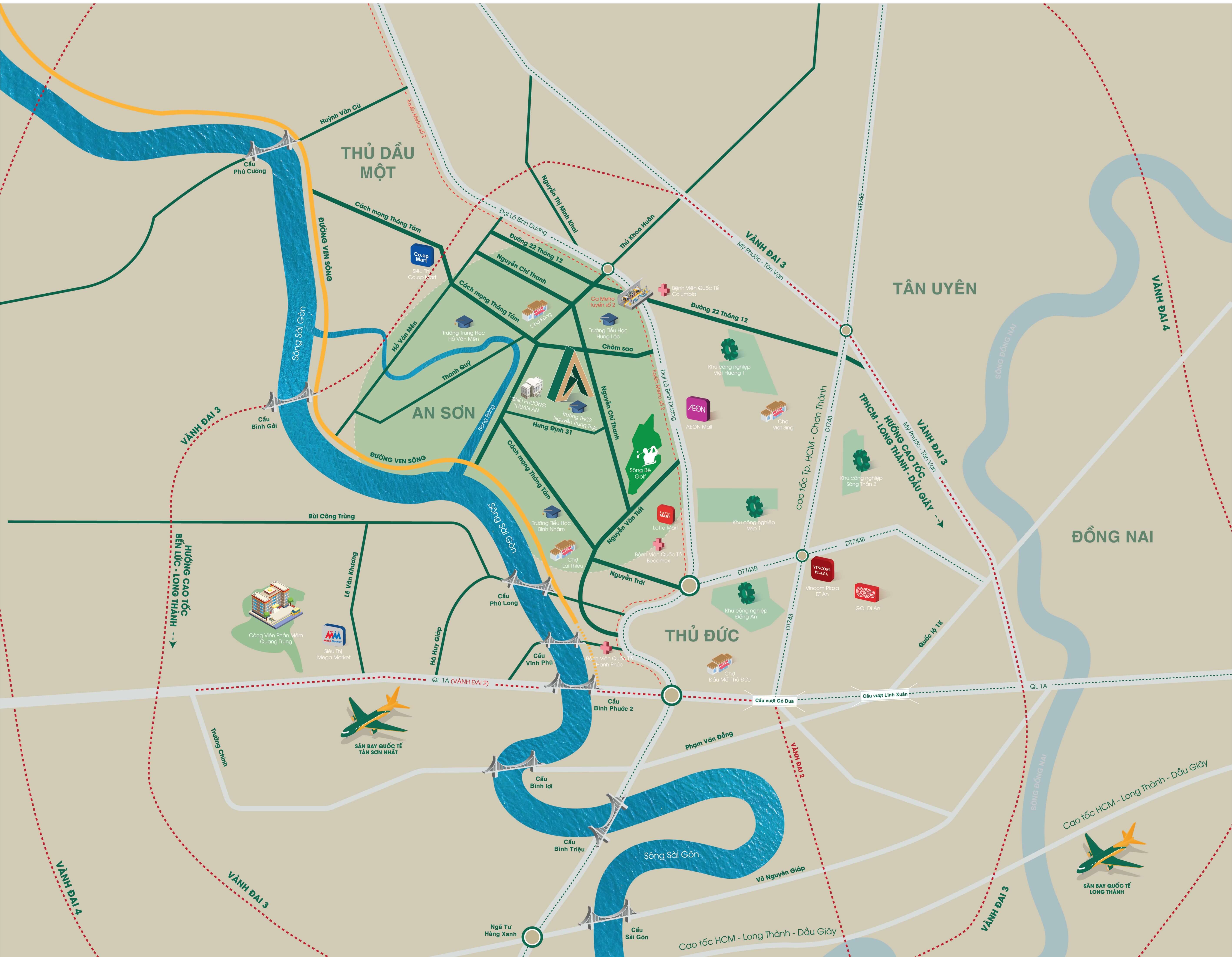 Từ vị trí dự án, cư dân có thể dễ dàng di chuyển qua các tuyến đường lớn như Quốc lộ 13, Quốc lộ 1A và cao tốc Mỹ Phước – Tân Vạn, rút ngắn thời gian kết nối đến trung tâm TP. Hồ Chí Minh, TP. Dĩ An, Thủ Dầu Một và các khu kinh tế trọng điểm phía Nam. Đây là lợi thế vượt trội giúp dự án trở thành tâm điểm giao thương và an cư lý tưởng của khu vực.