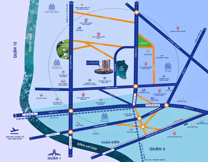The Felix tọa lạc tại vị trí chiến lược giữa ngã tư Nguyễn Du – Bùi Hữu Nghĩa, kết nối dễ dàng với TP.HCM, Thủ Dầu Một và Dĩ An. Xung quanh dự án là hệ thống hạ tầng hoàn thiện và chuỗi tiện ích sống động như: